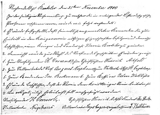 Vorsitzender H. Vorwerk. Schriftführer Heinrich Ackfeld Rendant Jos. Beckmann